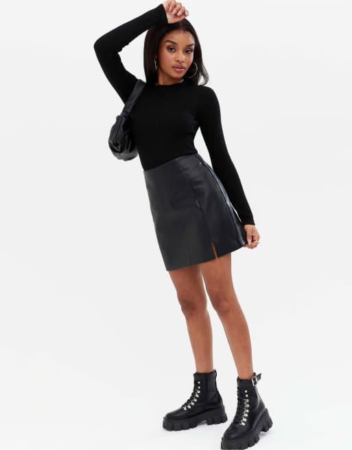 Product Item: Petite black faux new arrivals leather mini skirt