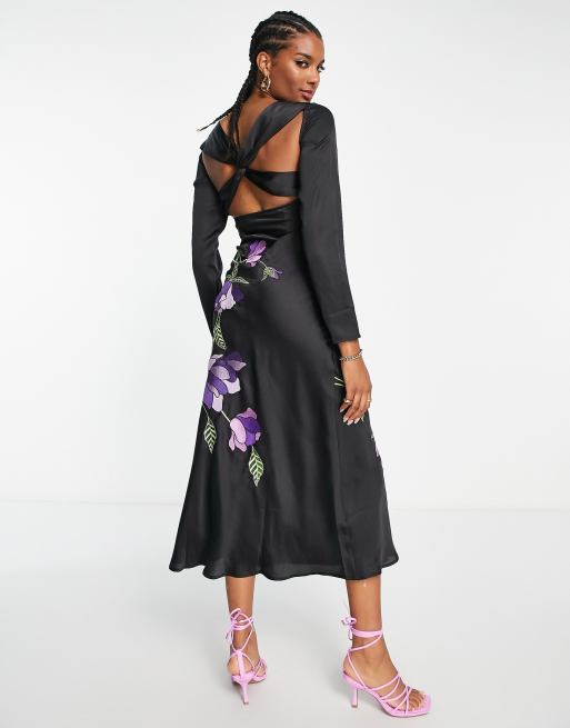Asos design long sleeve midi dress new arrivals with embroidered flowers and ruffle detail