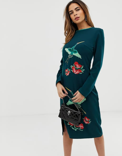 Asos design midi dress with pretty floral and bird new arrivals embroidery