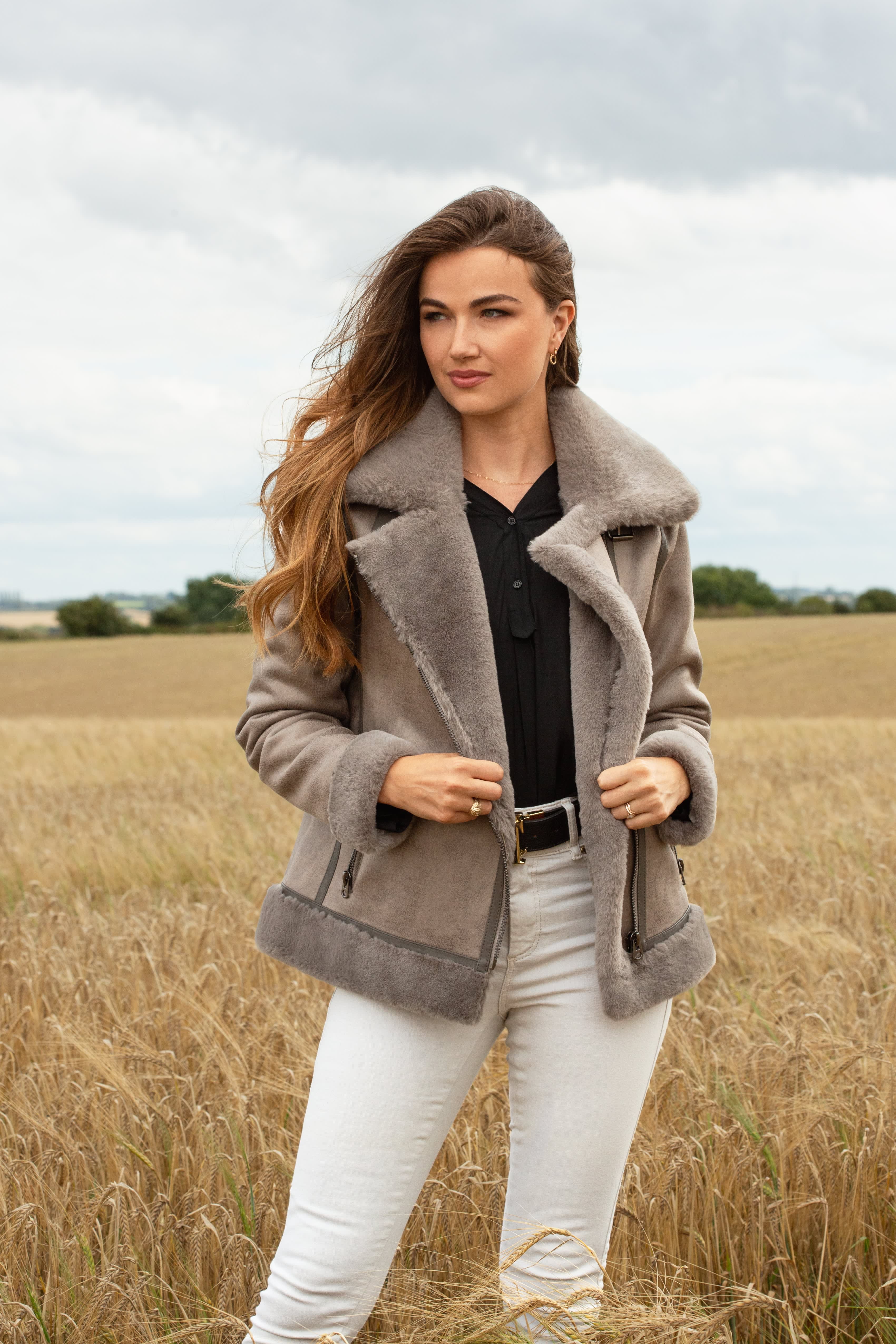 Grey faux shearling biker new arrivals jacket