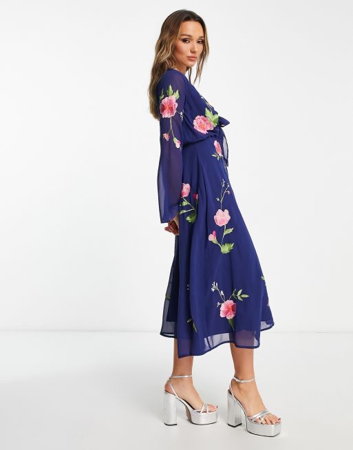 Asos design midi dress with pretty floral and bird new arrivals embroidery