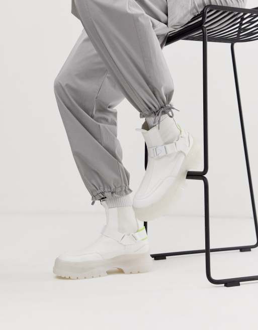 • ASOS DESIGN chelsea boots in white faux leather with strap detail and chunky sole