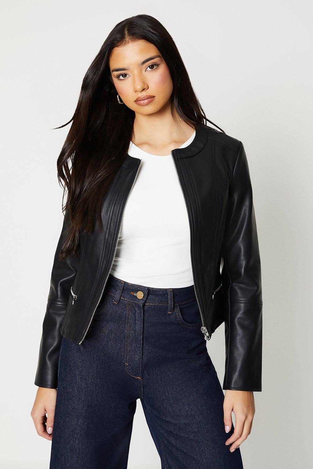 Black collarless faux leather new arrivals jacket